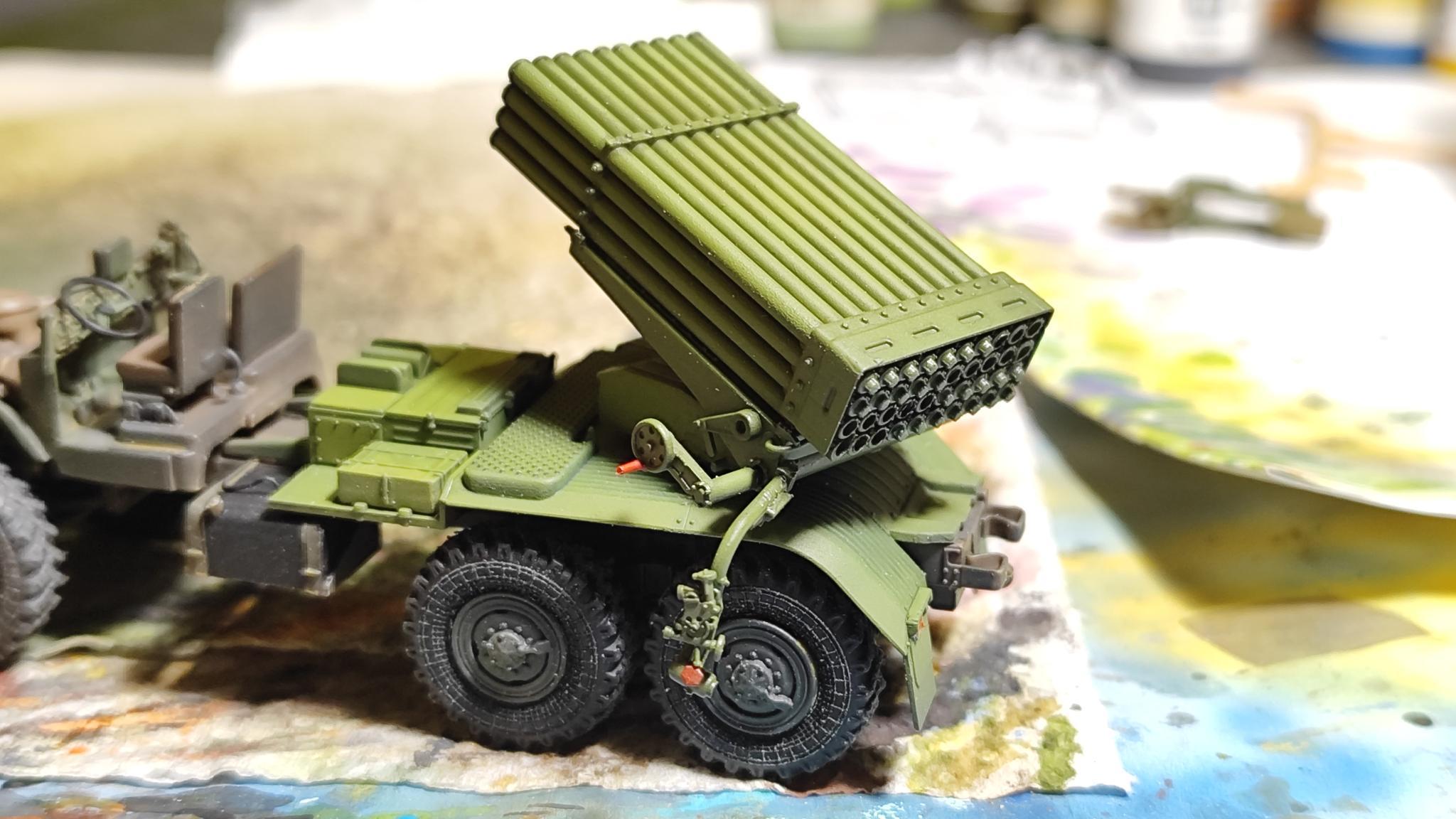 Alapozás Vallejo zöld akrillal történt (70.611), kis száradás és jöhetett a szín. A végső eredménynek egy magyar Uralt szerettem volna, így a szín keverést abba az irányba kezdtem eltolni. 2-3 mintakeverés után meg is lett az elfogadható alapszín. Ez több rétegben lett felfújva, majd világosított tónusokkal fakítottam. A jármű színéhez ezek a festékek lettek felhasználva: Yellow Ochre (70.913), Ivory RLM05 (71.106), Golden Olive (70.857), Gunship Green (71.014). Egyik másik alkatrész szándékosan kapott más tónust, hogy kicsit megtörje a homogén zöld kinézetet. Utolsó színként jött a piros. A kezelőfelületek és a rakéta záró kupakok lettek kifestve. Száradás után jöhetett egy köztes védő lakk. Erre pedig kezdődött a wash. Találtam itthon egy szürke járművekhez javasolt színt, ami zöldes kékes szürkés MIG prod (P285). Ezzel lett a felépítmény alsó lemeze és a szerelékes dobozok lekenve. Végül a fülke és a rakéta konténer kapott fekete színűt (Tamiya panel liner). Mikor ez elkészült, akkor jött a végső készre szerelése a teherautónak. Ezután jöhetett némi enamel koszolás, amit kapott minden felület a gépen (kerekek, alváz, fülke, felépítmény). Koszolás után jöhetett a lámpák elkészítése. A gyári átlátszókat nem használtam, jött a saját módszer: króm filc a foncsor helyére, majd UV lakk és a szükséges helyeken átlátszó festék (index, féklámpák). Végül kapott egy lágy porolást, egy homokszínű ködöléssel.