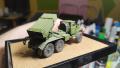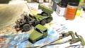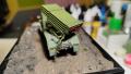 Az alváz kész, fülke kész, jöhet a felépítmény. A felépítményt is olyan állapotban akartam tartani, hogy egyszerűbb legyen festeni, így nem lett készre ragasztva minden. Az alkatrészeket alig kellett sorjázni, több darabnál a ragasztó nem is lett volna szükséges. Így a festésig ragasztó nélkül szereltem össze őket. A rakéta forgó zsámolya szintén szép darab, nem kellett sokat csiszolgatni. A hordozón pedig gyárilag forgatható, emelhető. A rakéta konténer pedig ugye hibátlan pontos darab. A konténer célzó berendezése az szorult némi sorjázásra. Itt eszközöltem egy kis házi barkácsot, így a valóságban kihajtható kart 0,2-es dróttal megcsapoltam és így nálam is hajtogatható lett (később a festésnél úgy 10-szer törtem volna le, ha nem így van). A referenciafotókon látható, hogy az irányzótól egy kábel köteg fut a rakéta konténer jobb oldalára, így ezt megcsináltam én is, valamint a kézi kerékre ragasztottam drótból egy fogókát, mi majd piros lesz, így nem elhagyható részlete, színfoltja lesz a műnek. Amit még a rakétás részen módosítottam, az az, hogy akartam üres vetőcsöveket is látni. Így ki lett jelölve melyik lesz üres és jöhetett a fúrás. Valahol olvastam, hogy a vetőcsőben a gyújtás úgy van kialakítva, hogy a rakéták szimmetrikusan vannak kilőve, hogy a tömegközéppontja megmaradjon a járműnek. Pontos tüzelési sorrend hiányában legalább szimmetrikusra készítettem el a vetőcsövek fúrását.
