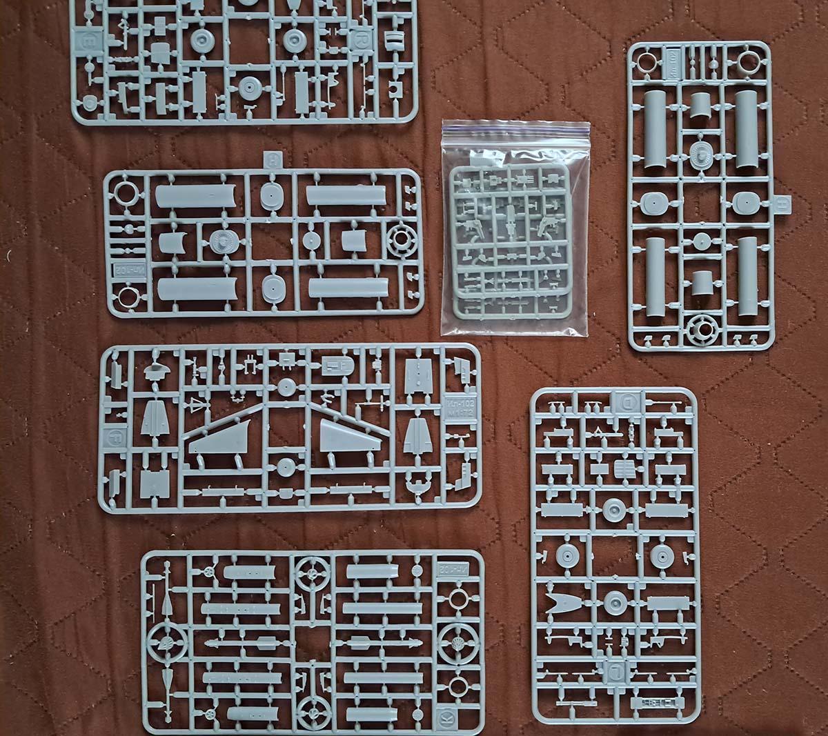 A munka a kabin berendezésével kezdődik. Külön öntőkereten kapjuk a két K-36-os katapultülés darabjait. 22 darabból kell összeépíteni. Na? Nem semmi, ugye? Amúgy az alkatrészek minősége a közepesnél valamivel jobb, bár az egyik hajtómű-gondolán volt vetemedés, de javítható. Volt kis megfolyás is, sorja is, de összességében nem éri el az Amodelnél tapasztalható minőséget – annál jobb! Az öntőkereteken van bőven, nincs számozása az alkatrészeknek, így időnként keresgélni kell. Persze a makettező olyan, mint a képzeletbeli nyugdíjas: mindig ráér. (Haha!) Az orr-részbe beépítendő 9 gramm súly szükségességét jelezték.