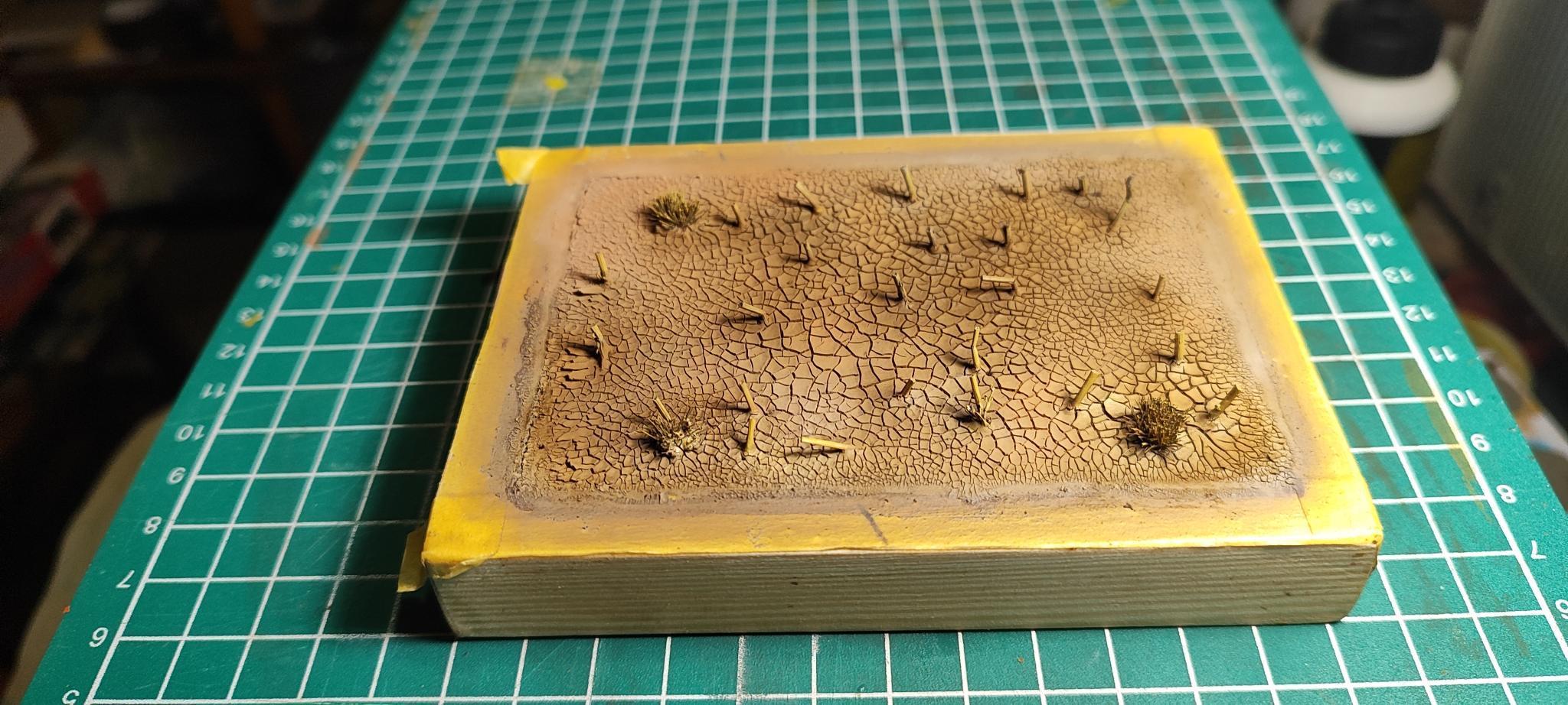 A végső méret megvan, keret összeállt jöhet a lényeg. Netes ötletgyűjtés után jöhetett egy száraz, aratás utáni szántóföld megvalósítása. Az első sikertelen próbálkozás után jött a következő, ami már jó lett: klubtárstól kölcsönkapott AK akril kence (Wet Crackle effects AK8034). Ez egy mogyorókrémhez hasonló állagú nyúlós anyag, amit rögtön az XPS lapra tudtam kenni, majd jó fél nap radiátoron száradás után beteljesíti funkcióját és repedtre szárad meg. Amíg friss és kenhető, addig alakítható is. Vízzel higítva a repedéseken tudunk finomítani (vizesebb anyag, vékonyabb apróbb repedések).
