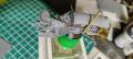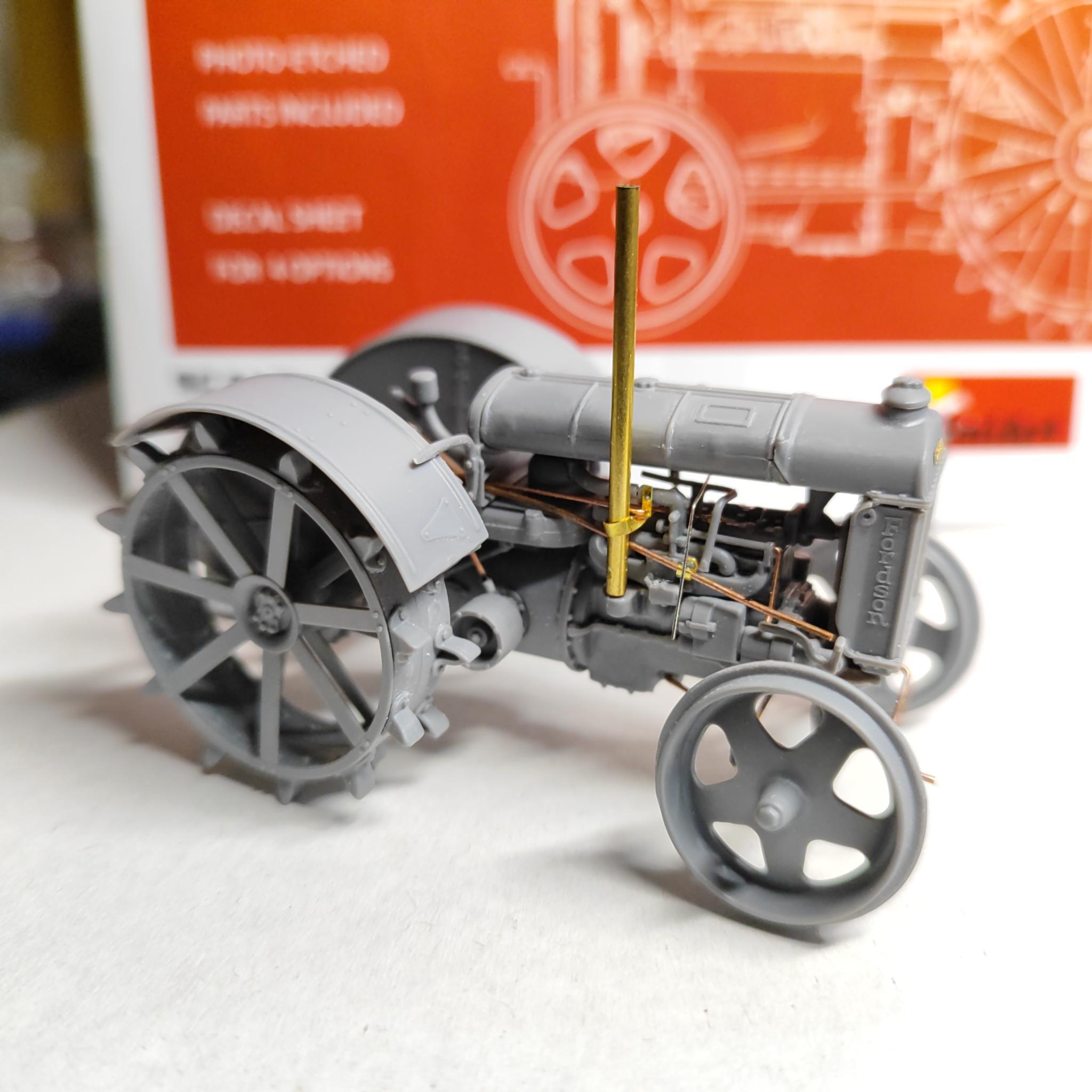 Mivel biztos voltam benne, hogy a vékony rudazat-alkatrészek a sok kézbenforgatás (építés, tömítés, festés, vedöring) során biztosan sérülni fognak, így az elejétől kezdve az volt a koncepcióm, hogy amit csak lehet, rézdrótra cserélek. Így minden rúd végéről a csatlakozást levágtam, megfuratoltam, majd ment bele a megfelelő méretű drót. A minimális mellékelt réztartalom (amit a rudazat rögzítéséhez adtak, egy Fordson névtábla a hűtő tetejére és három rendszámtábla) a drótokkal együtt már egész tetemes mennyiségre duzzadt. A motor fölötti tartályt nem ragasztottam a helyére, mert így a későbbi festés könnyebb lesz, valamint a blokk kábelezését ezután már nem lehet elvégezni. Ahogy haladt az építés, a futóműnél is jobbnak láttam a nagyobb, sérülékenyebb rudakat drótra cserélni. Majd a kézivezérlés karjait is cseréltem. Végül alig maradt, amit eredeti pompájában hagytam.