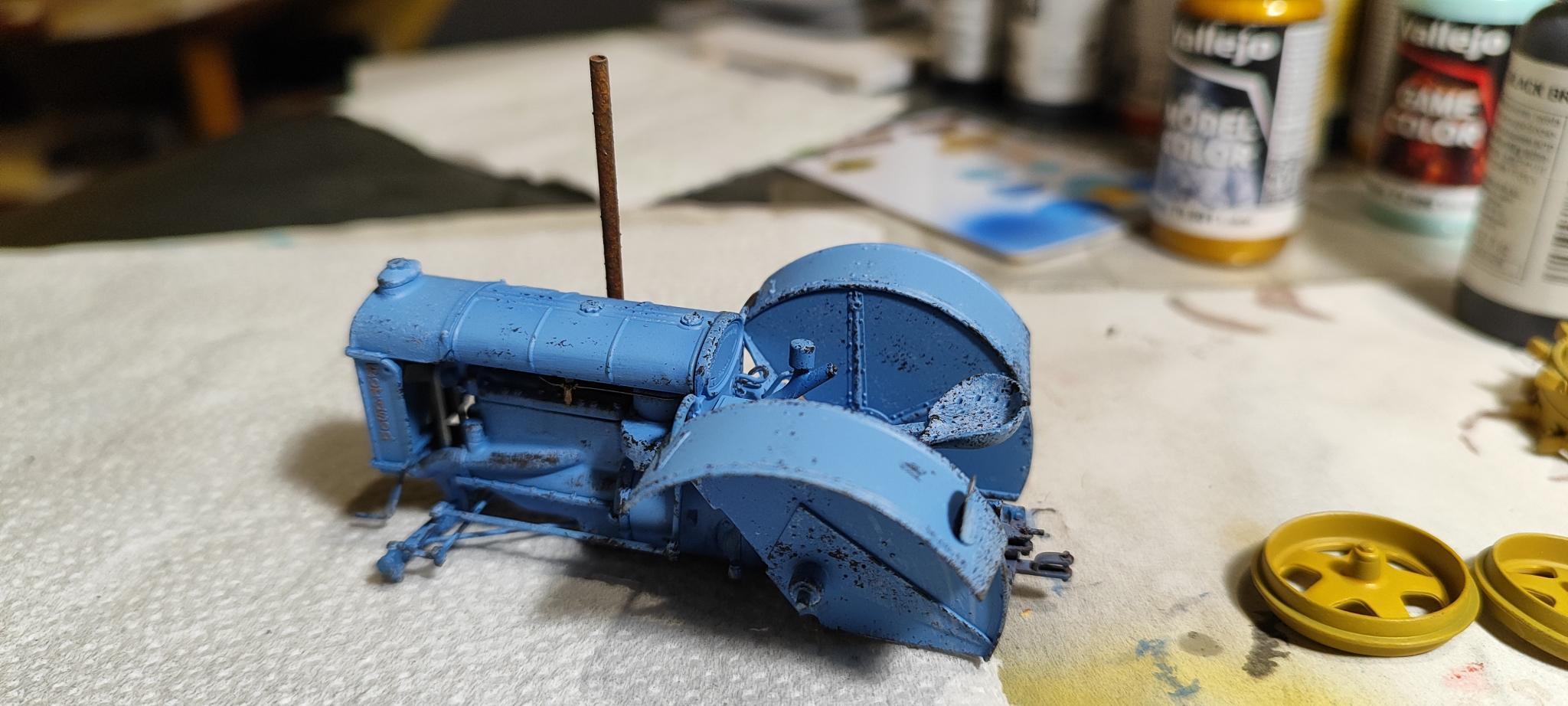 A rozsdafestés nehezebb volt, mivel a traki már szerelt állapotban tartalmazza a motort. Az általam kedvelt szivacsos technikát itt nem tudtam kivitelezni, mert elég sok minden kitakarta a felületeket. Maradt az ecsetes festés. Alapozónak rozsdabarna (70.605), majd az ecsettel majdnem száraz ecsetes állapotban tapogatva a kipufogó leömlőt meg lehetett foltozni. Ezt szépen sorban a következő színekkel: rozsda (71.080), világos rozsda (71.129), sötétbarna (71.042), és narancsrozsda (71.130) színekkel. Mikor végeztem az első körrel, jött még egy, ugyanezen színekkel a jobb átfedés miatt. A kipufogó - mivel még kiszerelhető állapotban van (a csapolás miatt eltávolítható) - egy alkoholos átmosást követően ugyanezeket a színeket kapta, de ezt már szivacsos technikával. A szín mellett a rozsdás textúrát úgy lehet elérni, hogy akkor kell használni a festéket, amikor már kezd puddingossá válni. Így az egyszerű hengeres csőből egy textúrázott rozsdafoltos kipufogót kapunk a munka végére. A jobb oldalon látható hengeres kihajtás (valószínű egy szalagos lehajtás tárcsája) szintén ezeket a színeket kapta, de hígabb változatban és körkörös ecsetes festéssel, így imitálva a forgó mozgás általi sima, de elkent rozsdás felületet.