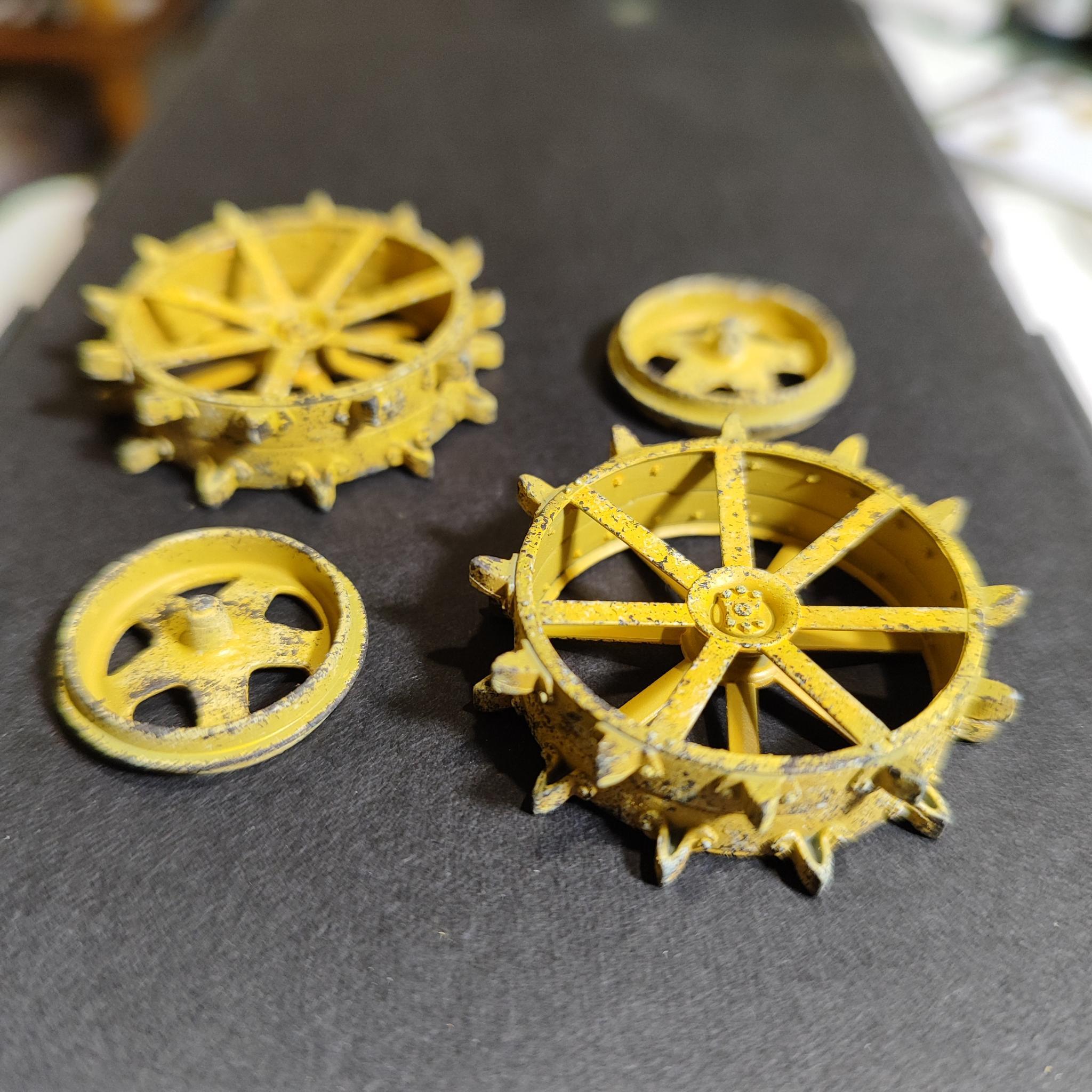 A kerekeknél a sárgára is ugyanezt a barnás koptatást használtam, szintén szivaccsal. Itt kipróbáltam, hogy nem a sárga világosított árnyalatával, hanem törtfehérrel (71.279) szivacsozom meg a felületeket. A fehér pöttyök nagyon jól kiemelték a korábbi barna maradványokat, így sokkal jobbá vált a felület.