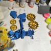 Alapozás Vallejo világosbarna akrillal (73.606), kis száradás és jöhetett a szín. A festési útmutatóból az egyik kék-sárgát választottam, pár keverés után meg is lett a két alapszín. A kék ennek a két színnek a keveréke: Flat Blue (70.962) és UK azúrkék (71.108); a sárga pedig ezekből van: okkersárga (70.913) és aranysárga (70.948). A sok bonyolult felület miatt ez sok rétegben került felfújásra, mert nem lehetett telibe festeni, különben megfolyt volna.