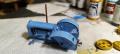 A rozsdás felületek után megkapta a világos festéklepattogzódást a kék egy erősen fehérrel kevert árnyalatával, szintén szivaccsal. Amint ezzel végeztem, ecsettel és szivaccsal is kapott egy sötét lepattogzódást. Az egyik Youtube videóban láttam, hogy erre mindig a german black brown (70.822) színt használták, mivel nem fekete, hanem barnás árnyalatú és sokkal életszerűbb tőle a munka. Ez szépen működik sárga, homokszín, zöld és bármilyen egyéb felülettel is. Erre jött még némi világos szárazecsetelés a fenti élekre, valamint némi sötétbarna szárazecsetelés a hasára és a motor körüli helyekre.