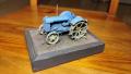 A keréknyomhoz először megrajzoltam és kinyomtattam a kerék másolatát, mert nem a makettet akartam összetörni, ha baj lesz. Utána az első kerekek nyomát szerkesztettem ki egy kis maszkolószalag segítségével. A keréknyomba sötét pigmentpor került, majd beleragasztottam a trakit. Az egyetlen maradék a keret lefestése volt, amit fekete és sötétbarna 1:1 keverékével két rétegben kentem le. Jöhetett még egy kis névtábla, szintén 3D nyomtatva, kifestve és felragasztva a keret szélére.