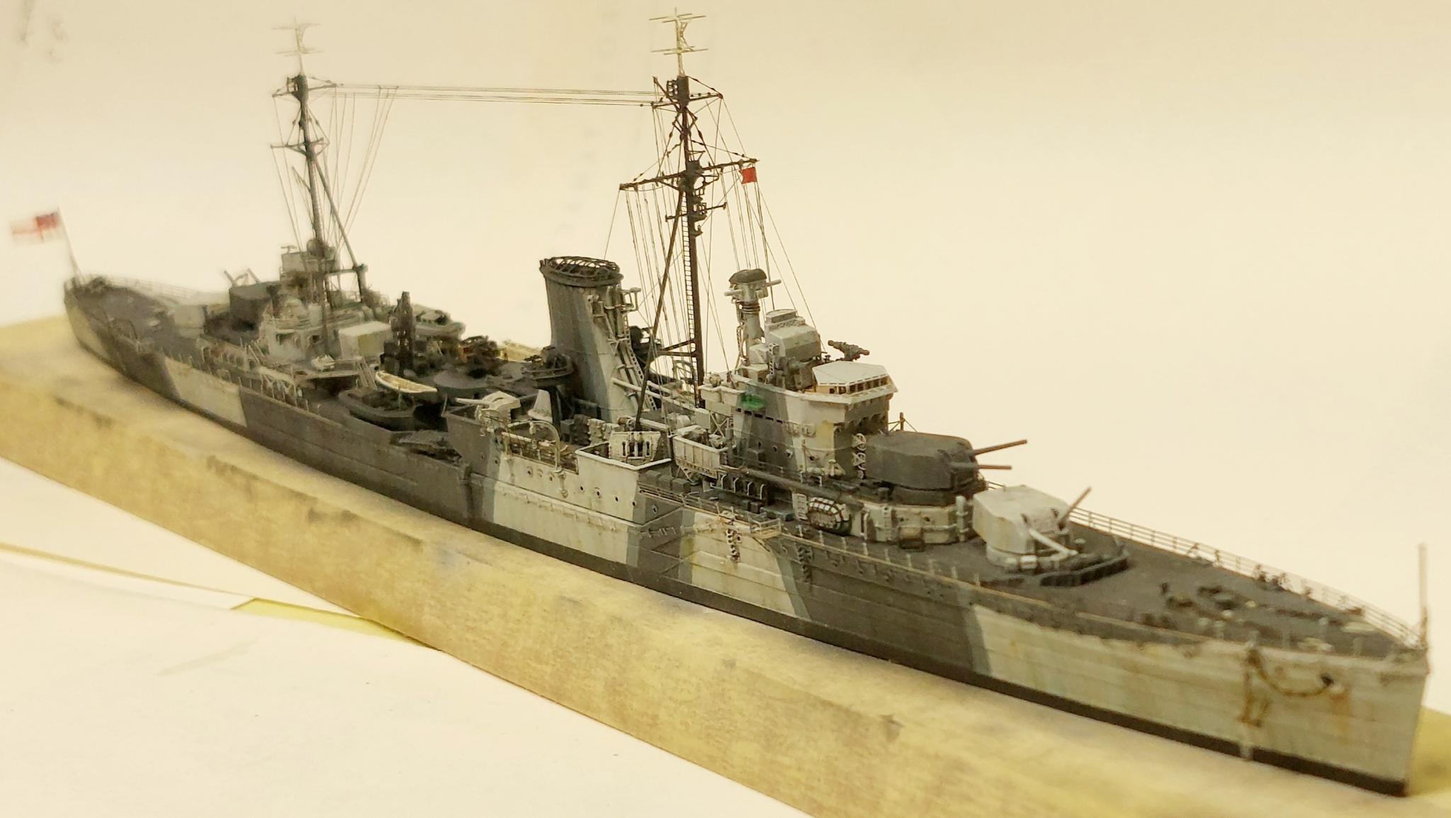 A nyitott híd fedélzetét fakított WEM Corticene festékkel fújtam le. Fekete helyett igen sötétszürke (Revell 9) lett a vízvonal és a kémény teteje, majd a kamuflázs színei közül WEM 507A követte a hajótest maszkolása után. A WEM 507C felvitele előtt újabb maszkolási szakasz következett. Utolsó lépésként középszürke csíkokat fújtam a két szürke színsávot elválasztó területek nagy részére, de nem mindenhol. Minden színt fakítottam, bár ez a fényképeken nem igazán látszik. Bevallom, nem igazán tetszett az előzőleg elkészült HMS York építésénél használt korábbi WEM 507C sárgás árnyalata, és vettem a bátorságot, hogy kék és fehér színnel módosítsam, így hűvösebb és világosabb árnyalatú lett. Egyébként nagyra értékelem a Colourcoats enamelek gazdag választékát, színhűségét és minőségét, és ameddig csak tudom, szeretném használni őket, annak ellenére, hogy az akrilfestékek használata lett jó pár éve az általános trend. A cég ismételt tulajdonosváltása nagyon aggasztott, és ahhoz vezetett, hogy ezekből a festékekből olyan mennyiséget vásároltam össze, ami messze meghaladja az előre látható szükségleteimet. Az 507C azonban egy gyakran használt árnyalat, ezért minden csepp készletemet el akarom használni. Sajnos rendkívül nehéz ilyen festékeket beszerezni Magyarországon, mivel a nemzetközi szállítási szabályozások egyre szigorúbbak. Nagyon utálom a maszkolást, és igyekszem minimális szinten tartani. A fedélzeteket ezért egyáltalán nem maszkoltam, az éles határokat csak a függőleges felületek lefújásának irányára odafigyelve értem el. A hídon és a kéményen a kamuflázs paneleinek határait és az apró részleteket finom ecsettel festettem. A kamuflázs eléggé kontrasztosra sikerült, de azt hiszem, az eredeti ilyennek volt szánva.