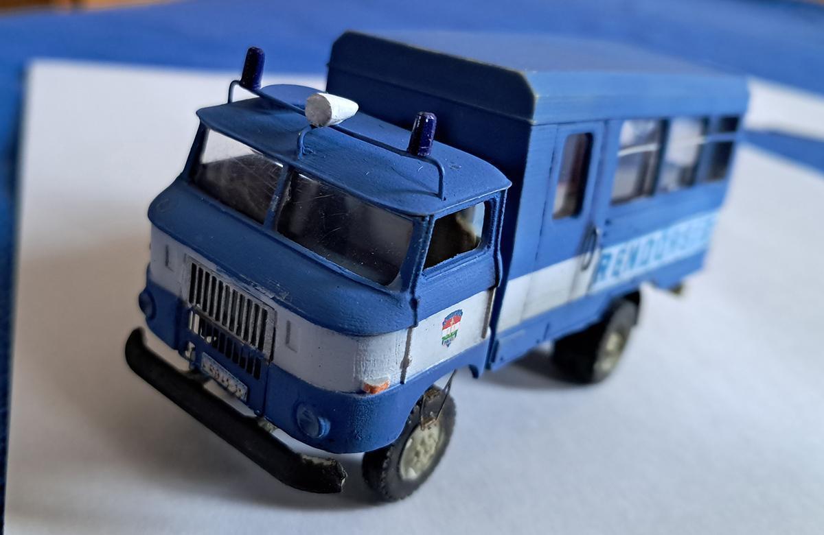 Vékony drótokból elkészítettem a vezetőfülke tetején lévő tartó rudazatot. Erre kerül föl a két kék lámpa és a hangszóró tölcsérje. Ezeket nem tartalmazza a készlet így a saját fantáziára és ügyességre hagyták a megoldást. Ugyanígy a két, jellegzetes indexbúrát. A sajátos "U" alakú fellépőket szépen elkészítették. Még a tipró rész is behajtható! Az oldalajtók mellé szerkesztettem vékony drótból kapaszkodókat. Öntőkeret darabokból elkészültek a kék lámpák (három kell! kettő előre, egy hátra) és a hangszóró szerepére kifaragott darab. A kéket csillogó sötétkék festékkel kentem le.