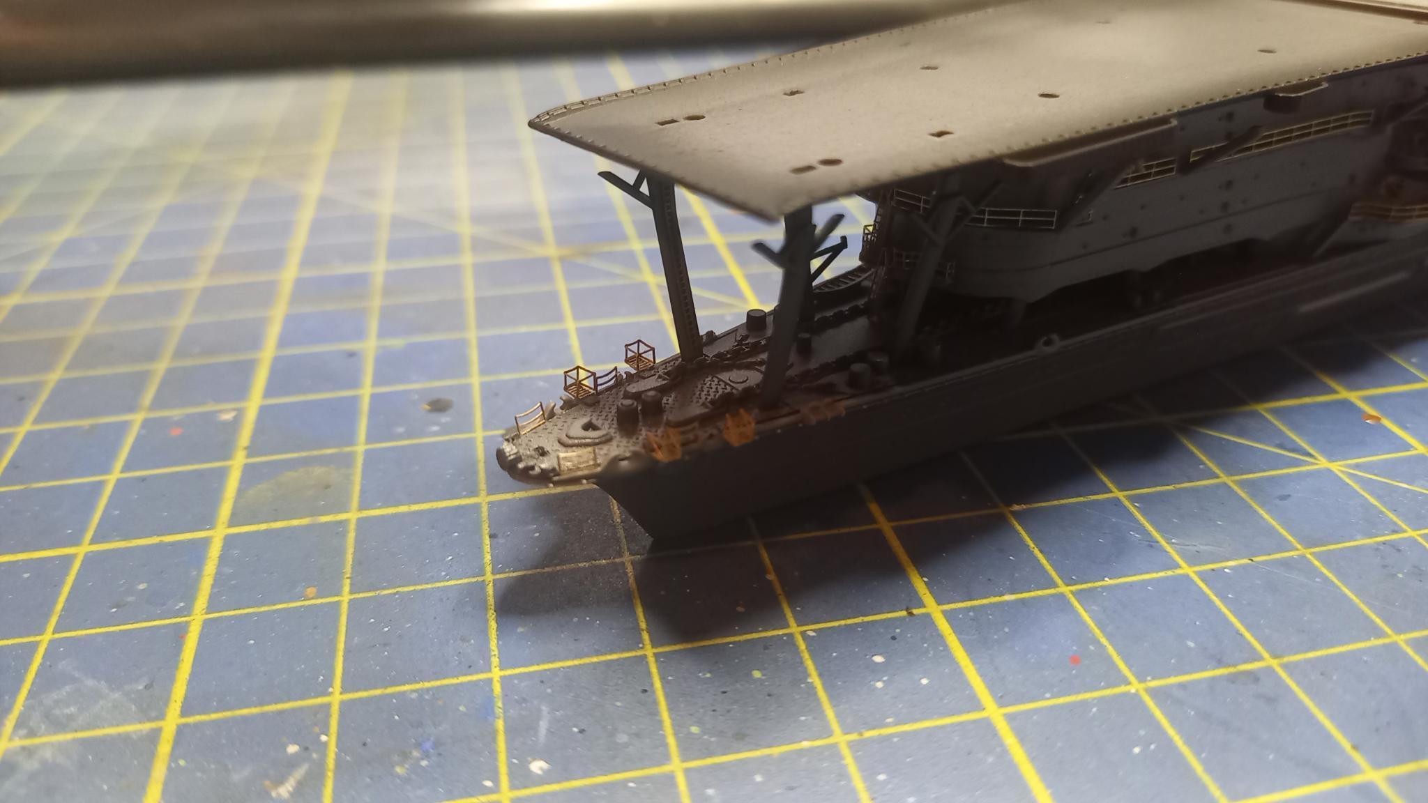 Végezetül néhány kép, hogy hogyan állunk most. A nagyobb részek csak szárazpróbaként vannak a helyükre helyezve, most jön majd a festés, a weathering, a repülőgépek, illetve kap majd a hajó egy dioramaalapot is.