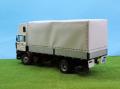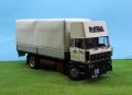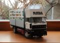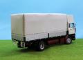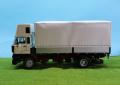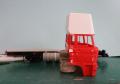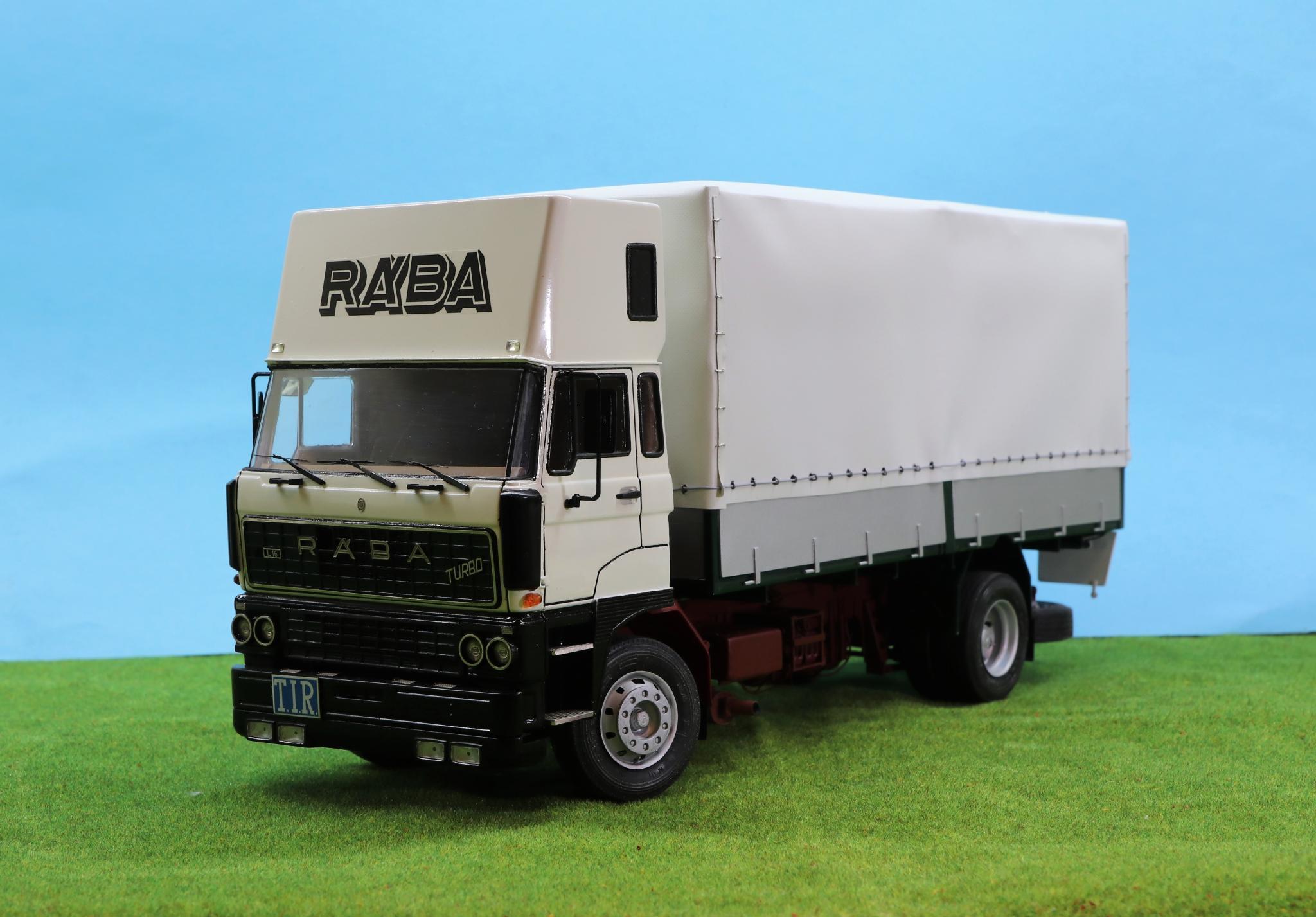 Szóval megvoltak az adatok, kaptam képeket, semmi akadálya nem volt az építésnek. Alapmakettként az Italeri Daf 3600-as makettjét használtam fel. Szokás szerint az alváz építésével kezdtem, az eleje az eredeti DAF maradt, a hátsó rész átalakítva, toldva lett. Hátulra egy MAN légrugós hátsó futómű került beépítésre némi átépítéssel. A DAF motor helyett egy Kusti által készített műgyanta Rába motor került bele, természetesen bekábelezve. A hátsó kerékagyakat szintén átalakítottam, mert ebben már egy egyszeres áttételű hátsó híd volt, ezért nem volt benne kerékagy-áttétel. Az alvázra elkészítettem egy új, nagy tankot, ezt bontott Italeri amerikai kamion tankjából állítottam össze. Készült rá tárolódoboz sztirolból, és még több kiegészítő is. A legnagyobb átépítés és egyben leglátványosabb is a fülke átépítése volt. Az eredeti Italeri fülke egy hosszú, hálóhelyes fülke volt, ezt függőlegesen szétvágtam az ajtók mögött, kivágtam belőle egy darabot, majd összeragasztottam. Ezután összeragasztottam a fülke elemeit, majd nekiláttam elkészíteni sztirolból az új tetőt. Ez elég munkás volt, mert több törés, ív van benne, nem csak egy egyszerű kockaforma. Sok próbálgatás, csiszolgatás után elkészült, majd alapozás után fehérre festettem. A fülkéhez használtam a Cseh CTM maratását, kívül-belül. A fülke belsejét is rövidebbre kellett vágnom, majd így elkészíteni. A kis oldalablakok esetén az eredeti ablakokat vágtam méretre, és úgy ragasztottam be, a tetőn látható oldalsó kis ablakot pedig 1 mm-es átlátszó sztirolból készítettem el. Kicseréltem a cseh maratásra az egész hűtőrácsot, műszerfalat, ablaktörlőket is, valamint az első lámpák is ebből a készletből jöttek. Az alvázra került egy segédalváz, majd nekiálltam a plató elkészítésének. Ez 1 és 2 mm-es sztirolból készült, néhol Evergreen profilok felhasználásával. A ponyvaanyagot Papp Lacitól kaptam, ennél elég macerás feladvány volt a sok ponyvarögzítő elkészítése. Itt kicsi bőrlyukasztót használtam, majd az előre kifúrt lyukakba 0,5 mm-es rézdrótokat ragasztottam félkörívben hajlítva. Miután a ponyva felkerült, átfűztem a furatokat a beragasztott füleken, majd vékony damilból vámzárzsinórt húztam bele. Elkészítettem hátra a lámpatartókat a jó barátomból, sztirolból. Sok apró kiegészítő került még rá, mielőtt a vitrinbe került volna.