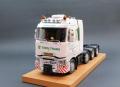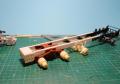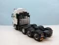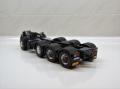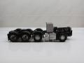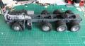 Reanult T kamiont nem készít egyetlen nagyobb gyártó sem, ezt a teljesen műgyanta átépítőt az A&N Model Trucks kínálatában lehet megvásárolni. Az építéshez felhasználtam az Italeri FH4-es Volvoját is, igaz abból csak leginkább a motor-váltó, első futómű került át. Az alváz kialakításánál is a Volvo volt a kiindulási alap, egy FH16-os 8x4-es 750 LE-s típus alvázáról méreteztem, és építettem meg a Renaultét. A speciális szállítás témakörében a Volvonak ez volt az akkori csúcsmodellje (azóta már van erősebb, és újabb), tehát adta magát, hogy ez lesz az alap. Az alváz első része az első futóművel együtt az Italeri készletéből került felhasználására, a váz többi része sztirolból készült. A második tengely szintén az A&N Model Trucks műgyanta terméke, Volvo futómű, a hajtott két hátsó futómű viszont régi Iatleri készletből származik, csak a speciális Volvo kerékaggyal kombináltam. A motor és a sebességváltó szintén az Italeri készletből származik. Az ilyen alvázépítésnél az egyik legnehezebb, és legtöbb pozicionálást igénylő feladat a futóművek jó beállítása, hogy a kész makettnél minden kerék leérjen a talpazatra, ne tartson ki egyik sem, mert nincs gyári illesztési pont. Ezen a folyamaton mindig rengeteget mérek, próbálok, hogy biztosan jó legyen a végén, mert később már nagyon nehéz javítani. Szóval megtörtént a futóművek beállítása, majd kábelezése. Hátulra felkerült egy vonófej, valamint elkészítettem sztirolból az első lökhárítóra egy erősített vonófejet, a vonórúddal való vontatáshoz. A vázat egy sötétszürke színnel fújtam le, a felnik pedig krómozva lettek.