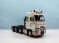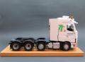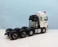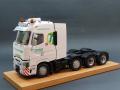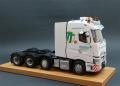 Ezzel párhuzamosan készült a fülke belső, ami apróbb feljavításokat, kiegészítőket kapott. Közben a fülkét is alapoztam, és előkészítettem a festéshez, bár volt vele egy kis gondom. Mivel egyben öntött műgyanta fülke, ezért volt egy kis deformálódása, amit meleg vizes-hajszárítós módszerrel próbáltam korrigálni. Azt már hamarabb eldöntöttem, hogy a vontató az olasz Tirol Trans flottás arculatát kapja majd, így fehér lett a fülke. A matricákat szokás szerint Kusti barátom készítette, amiben segítségemre volt egy osztrák barátom, aki több közeli, nagyfelbontású képet készített egy eredeti kamion dekorjáról. A fehér színt több helyen is alu színnel törtem meg, az első lökhárító aljára pedig piros csíkokat tettem, ahogy az sok esetben az ilyen vontatókon látható. Közben felkerült a kipufogódob is, valamint mögé sztirolból egy tároló láda. Baloldalra az AdBlue tartály, és az akkumulátortartó lett beépítve. A fülke mögé elkészítettem a tornyot (ezeknél a vontatóknál így hívják a fülke mögötti felépítményt), benne a sztirolból készült üzemanyagtartállyal, a hidraulika tartállyal, és a légtartályokkal, mind bekábelezve. Ennek a takarására speciális, nagyméretű légterelőket szoktak használni, amit szintén a fantáziám szerint alakítottam, és készítettem el sztirolból. Készítettem egy lámpasort a tetőre, speciális tartót a sárga villogóknak, de került még az elejére ledes kiegészítő fény is, valamint két légkürt a tetőre. Az oldalára felkerültek kiegészítő lámpák, szélességjelzők, munkalámpák.