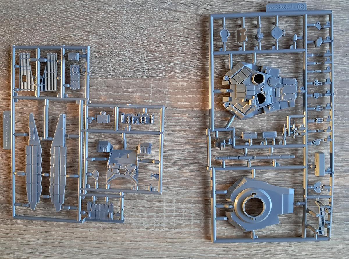 A dobozon látható felirat szerint 93 alkatrészből lehet megépíteni az orosz hadiipar e remekét. (Az eredetiket éppen most tesztelik Ukrajnában.) Alkatrész tényleg van bőven. Időnként több is mint kellene. A futógörgők belső alkatrészeit tartalmazó keretből kettőt is adtak. Hogy aztán a teknőt miért fémből készítették ez legyen a japán(?) gyártó titka. Szép tiszta munka. Ráadásul pontosan illeszkedik a többi műanyag részhez. Jó a kétfajta ragasztó használata bonyolít a dolgokon, de igazából nem zavaró. A műanyag alkatrészek tiszták eltekintve néhány valóban apró megfolyástól.