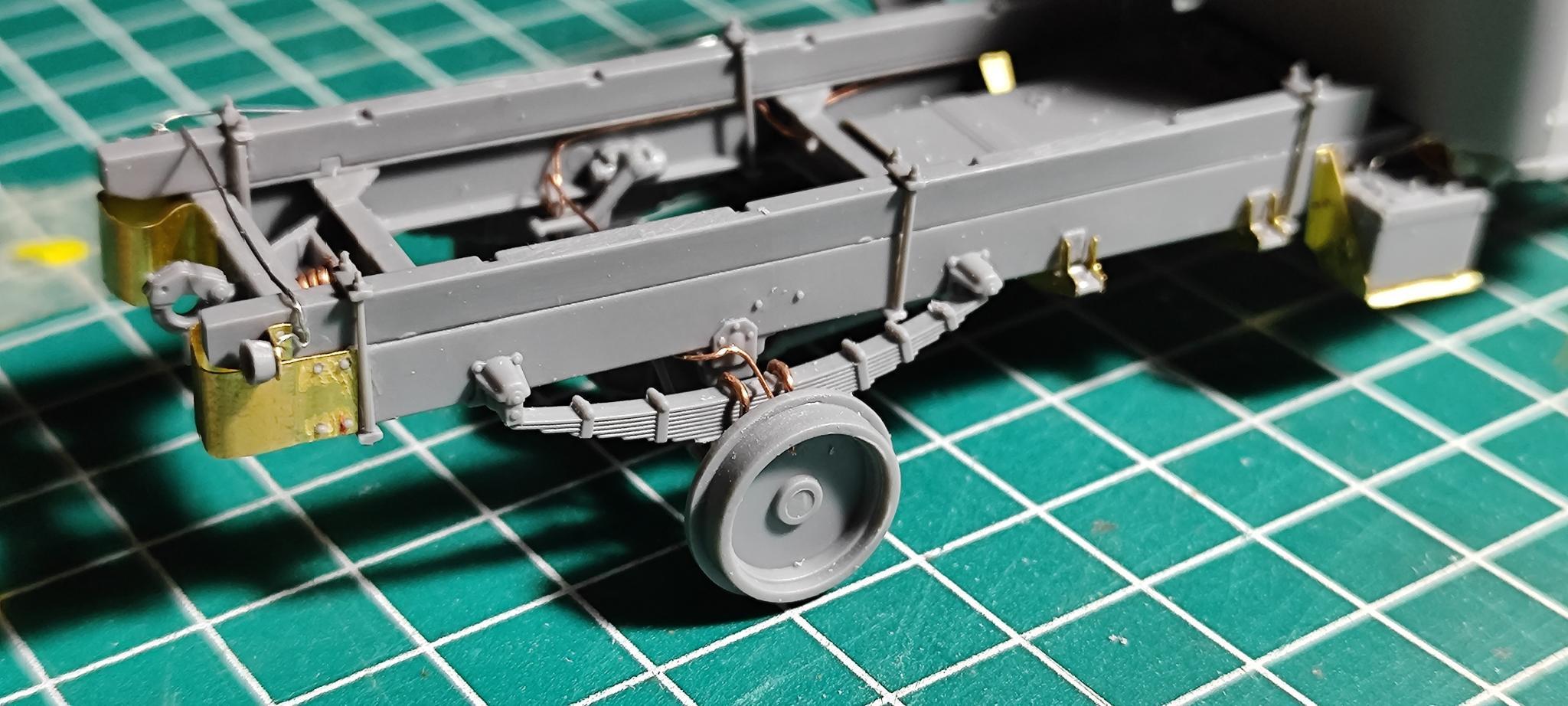 Az építést az útmutató a motorblokkal kezdi. Mivel 1:35-ös méretű a készlet és kellően (túlzottan) bontott minden, egyszerűbb a feljavításokat is eszközölni. Megfelelő anyaggyűjtést követően úgy döntöttem, hogy a teljes blokk megkapja a vezetékezést, csövezést. Az értelmezhető referenciaképeknek hála minden cső és kábel megkapta a maga helyét a motor körül. A motort annyi alkatrészből kellett megépíteni, hogy önállóan erre (feljavításokkal együtt) egy fél hónap elment. A blokk elkészülése után jöhetett az alváz. Hagyományos létraalváz sok kereszttartóval és kismillió apró egyéb alkatrésszel. Aki szeret a részletekben elveszni, annak nagyon ajánlott a Miniart nyújtotta lehetőség, aki viszont haladósra szereti venni, annak gyorsan elmehet a kedve ettől a filozófiától. Ha már a blokk minden kábelezést megkapott, akkor nekikezdtem az autó többi részének feljavításához is. Fékek, lámpák, olajszűrő, üzemanyagszűrő, akksi. 35-ös méretű készlet és több méter drót került bele. Ennek legalább a fele a motortérben kapott helyet: trafó, gyújtáskábel, vezérlés, szűrők, generátor, önindító, lámpák.