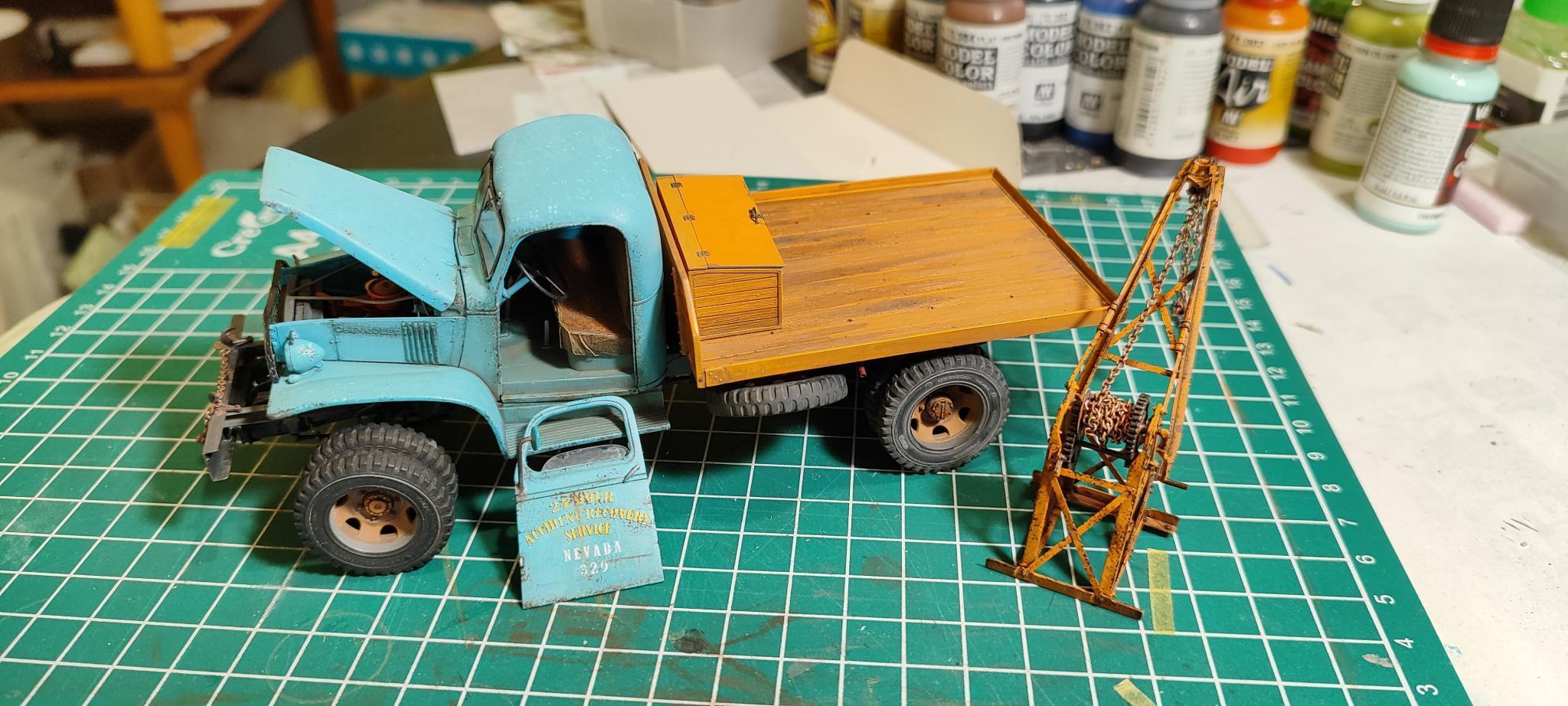 Végül befejezésre került a hátsó traktus, plató, szerszámosláda, daru. A fényszórókat, lámpákat most is a temus krómfilccel és körmös UV-gyantával oldottam meg, majd clear festékkel színeztem.