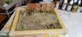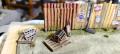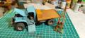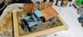Az elképzelés egy mutatós, de nem túl bonyolult alap elkészítése volt, ami a kis szervizautót autentikus helyzetben tudja ábrázolni. Ötletgyűjtés után úgy döntöttem, hogy nem készítek épületrészletet, csupán egy udvart és egy kerítésrészletet. Az alap XPS lapból és saját készítésű földből van, erről részletesebben írok a seprűs Zil-130-as és az erdész Zil-131-es cikkben. A kerítést kávés pálcikákból és alufóliából készített hullámlemezzel oldottam meg, amit a készlet öntőkereteiből készített kerítésvázra ragasztottam fel. A festés után nyomtattam pár reklámposztert különböző műhelytémában, amit vizes faragasztóval kentem le, így tartós, festhető és meg van óvva a sérülésektől. A fémimitáció miatt a széleit rozsdásítani kellett, majd mehetett fel a kerítésre.