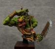 A bal kézben tartott bárdot szintén a Green Stuff World "Steel & Silver" készlet segítségével festettem. A bárd brutális formáját a durván megfestett élével még hangsúlyosabbá tettem. Vallejo rozsda effekt bemosókkal alaposan megdolgoztam, hogy tovább erősítsem a hatást. A villát eredetileg a vállába szúrva álmodta meg a figura faragója, de nekem nem tetszett. De mivel fel akartam használni, kifúrtam, fogtam egy darab cérnát és pillanatragasztóval tartást adtam neki. Ezzel a nyakába kötöttem, hogy mindig kéznél legyen. Így, ferdén rögzítve még több dinamikát ad a mozdulatának.