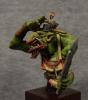 Elsőként a szájüreg belsejét festettem (piros matt Humbrol alapozás után) Kadmium Középvörös, Kadmium Sötétvörös, Mély Krómsárga keverékéből. Pontos arányokkal nem szolgálhatok, mindig érzésre keverem a színeket. A nyelv világosabb rózsaszínes lett. Árnyékhoz Égetett Sziennát adtam hozzá, fényhez Titánfehéret. Fehérek lettek a fogak is, száradás után Citadel Seraphim Sepia bemosóval imitáltam a lepedéket. Amint ez kész volt, összeragasztottam az alsó állkapcsot a fejjel, és az egész mehetett a torzóra.