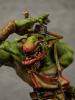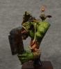 Elkészítettem az apróbb részleteket. Az ajkát több piros és rózsaszínes árnyalattal tettem durvává. A szakáll és a haj fakó vörösét többször átfestettem, mire elértem az elképzelt látványt. A szem részleteivel sokat nem foglalkoztam, sok úgyse látszik belőle. Az orr pirosát több vékony filterréteggel értem el, olajfestékkel. A körmök koszosságát bemosásokkal, a fülek belső részének textúráját szintén "vonalkázós" technikával értem el. Csak ezután ragasztottam a helyére a készre festett jobb kart - gondoltam, már nem fog aggatni. A fejfedőként funkcionáló serpenyő nyelét a Scale75 akril "Wood and Leather Paint Set" segítségével festettem. A fém része Green Stuff World "Metal Color, Steel & Silver" szettel készült, Vallejo rozsda effekt bemosókkal kezelve. Persze a jobb kézfejtől alig bírtam a helyére sakkozni a serpenyőt a feje tetején.
