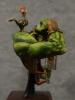 Ezt a zöld követte, ugyanezzel a technikával. Matt Krómoxid Zöld, Permanent Világoszöld, Világos Cinóberzöld, Kadmium Világossárga és Sötét Ultramarinkék keveréke volt az alap. Ehhez jött árnyéknak Égetett Szienna és Umbra. Fényhez Testszínt és Titánfehéret adtam hozzá. Arra kell különösen figyelni, hogy a bőr két színének tónusai egyformák legyenek. Ne legyen a zöldön például sötétebb az árnyék, mint a mellkas színén. Lezárásként a bőr mindkét színéhez több új árnyalatot kevertem és vékony ecsettel (5/0) apró vonalkákkal megtörtem a felület homogenitását. Ezzel egy durva, kemény bőrfelület hatását keltve a szemlélőben.