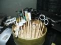 A póttartállyal már korábban elkezdtem foglalkozni. Van a testén egy áttörés, egy csatorna, ezt pótoltam. Ha jól emlékszem, akkor az indító hajtómű gázelvezetését oldották meg így, de ha mégsem, akkor hozzászólásban javítsatok ki nyugodtan. A tartály síkjából kiálló illesztési vonalakat pedig úgy oldottam meg, hogy negatívan kimaszkoltam, és vékonyan megfújtam Surfacerrel. A rakéták indítósínjeivel kicsit gondban voltam, úgy találtam, hogy az R-60-akhoz nem volt, csak egy pár, az R-73-ak sínjeit indokolatlannak tartottam felrakni, kellett tehát egy másik pár. Némi keresgélés után úgy döntöttem, hogy a legjobb megoldás lemásolni a meglévő darabokat. Egy nagyobb kupakra felragasztottam az egyik darabot, körbekentem szaniter szilikonnal, a formaleválasztó használatától azt hiszem, eltekintettem, majd vártam. Kikeményedés után meleg vízben átmelegített Epkittet szívtam fel fecskendőbe, aztán megpróbáltam beadagolni ebbe a sziló zsebbe. Hááát... 2 nap után lebontottam a még kissé hajlékony öntvényről a formát, majd az egész folyamatot megismételtem. Elég pepecs munka volt, de úgy emlékszem, hogy a másik lehetőség meg két pár Eduard indító lett volna, a a makett árának a feléért. Friss diplomásként spórolni kellett.