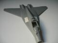 Azt hiszem, nem árulok el nagy titkot azzal, hogy fényes lakkozás következett, majd a matricázás. Az ember általában a szebb matricát keresi, éles határvonalakat, élénk színekkel. Na, most nem. Úgy válogattam össze a két ívről, hogy mindenből a halványabb, fakóbb kerüljön fel. A függőlegesen lévőzászlós csillaghoz vágni is kellett, de nem annyit, amennyit a belül lévő oldalszámokhoz kellett. Mondjuk azóta sem értem, hogy kinek és miért lehetett ilyen khmm... meglehetősen szokatlan ötlete? Egyébként egy kis matricalágyító szépen elrendezte az összes dekorációt. A matricázás után én viszont maradtam a jól bevált dolgoknál, egy újabb réteg fényes lakk következett, hogy megvédjem a jelzéseket a továbbiaktól. Ezek a továbbiak voltak egy-egy enyhe átködölés a matricák többségén az álca színeivel. Tényleg enyhén, szinte csak ijesztgettem a festékkel a matricákat. Izgalmas volt. ez után jött egy sötétszürkés, sötétbarnás alap bemosás, átmosás, ami érdekes módon nem ült meg mindenhol, néhol pedig szétszaladt a felületen. Lehet, hogy túl sok volt már a lakk. Annyira nem is baj, nem is akartam hogy homogén legyen a koszolás. A biztonság kedvéért a hajtómű gondolák is kaptak pár koszcsíkot, aztán jöhetett egy félfényes, lezáró lakkréteg és a végszerelés. Kabin nyitva, a jellegzetes tömítő csík felfestve, vezérsíkok enyhén kitérítve. Életem eddig legjobban sikerült Fulcrumja.