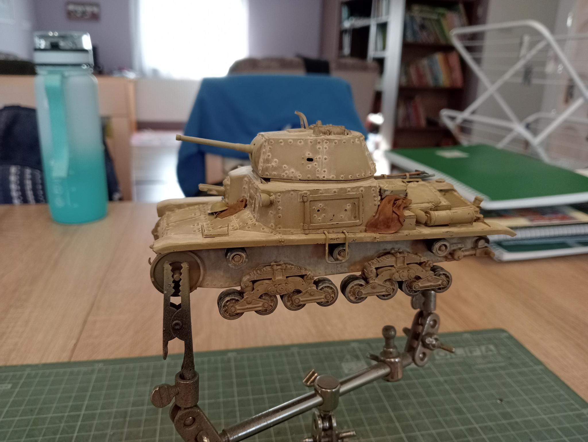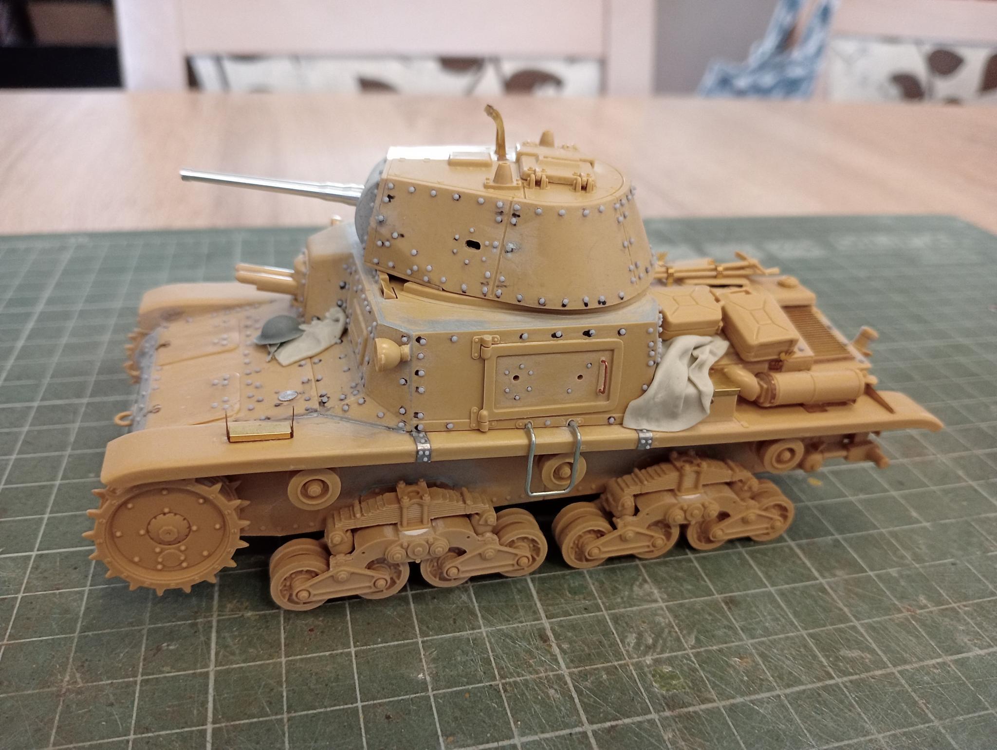 Megmondom őszintén, nem tudom, milyen színeket használtak eredetileg a taljánok, így a Tamiya által ajánlott XF60 és XF59 2:1 arányú keverékét vettem alapul úgy, hogy azt még fehérrel világosítottam, ez lett az alapszín. Ezt még tovább világosítva megfújtam a panelek közepét. Ma már sokkal kontrasztosabbra festeném, de az is igaz, hogy én személy szerint nem vagyok híve a „spanyol iskolának”. Emiatt a weatheringet is visszafogottan alkalmazom, ez látszik is a tankon. Ezután következtek a kopások (Vallejo Panzer Aces dark rust), majd a befolyatás AK dark yellow-val. Arra már őszintén szólva ne emlékszem, hogy pontosan mikor, de valahogy ekkortájt kapott egy réteg matt Gunze lakkot is a gépezet.
