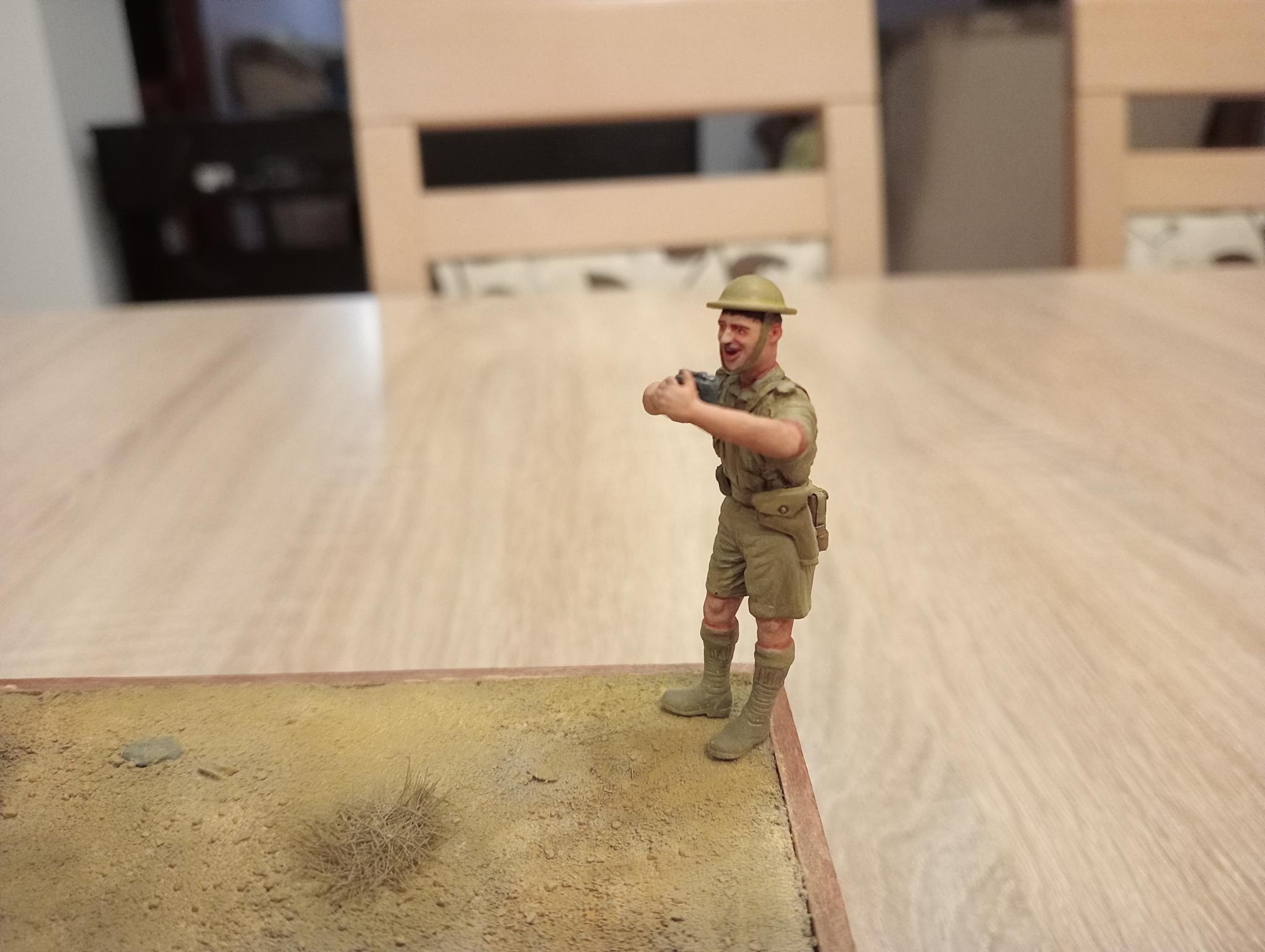 Itt is több dolgon gondolkodtam, de végül úgy döntöttem, hogy a Miniart British tank riders (special edition, 35299) készletből használok fel hármat, amelyeket Hornet fejekkel javítottam fel, illetve elkészítettem a puskák, (és részben) a hátizsákok szíjait is fém fóliából. A fényképező figura mozdulatait át kellett alakítanom, ezért részben levágtam a bal karját és Magic Sculp, valamint a Firma49 egyik kézfejének felhasználásával újat készítettem neki. A jobb kézfej mutatóújját megvágtam és kicsit elmozdítva ragasztottam vissza, hogy elférjen a kézben a fényképezőgép, amit a hordtáskával együtt a neten talált kép alapján sztirolból, fémfóliából és Magic Sculpból készítettem. Fekete alapozás után mindegyikre Tamiya deck tan-t fújtam felülről, előárnyékolásként. Az egyenruhákat AK 3rdGen és Vallejo akrilokkal festettem, de a pontos árnyalatokra sajnos nem emlékszem már. Az viszont biztos, hogy a világosabb részeknél az alapszínbe AK 3rdGen light earthot kevertem. Az utóbbi időben áttértem arra, hogy több (legalább 3-4) hígabb rétegben gyakorlatilag átmosom a figurákat, ezzel kialakul egy jó alap a további kiemelésekhez. Ezt is egy Nightshift videóban láttam először.