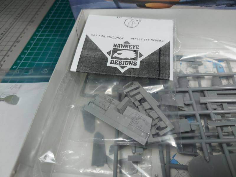 Hasegawa 1/48 Hurricane Mk.IIc (JT51) törzsfelek, szárnyak, orrburkolat és kabin alkatrészei leválasztva, kabinban a kilökőtüske nyomok tömítve, de nem csiszolva (hozzám is így került) + Eduard FE253 maratás + gyanta kipufogók (ismeretlen másolat): 8.000Ft